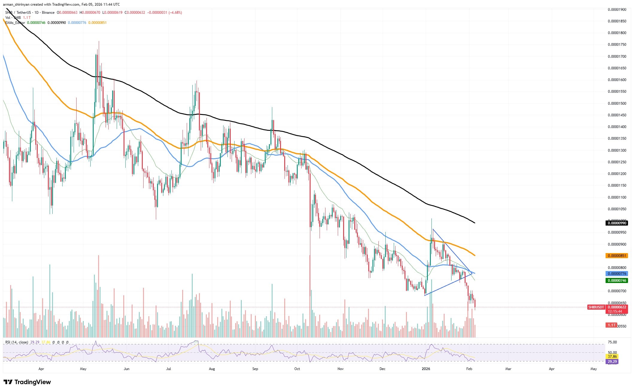 受持续抛压影响,柴犬币(SHIB)仍在挣扎,整体加密货币市场依然疲软。价格走势显示出长期下跌趋势,多次试图收复重要移动平均线和阻力位均告失败。每次反弹尝试都因新的抛售而受阻,导致SHIB回落至近期低点。
