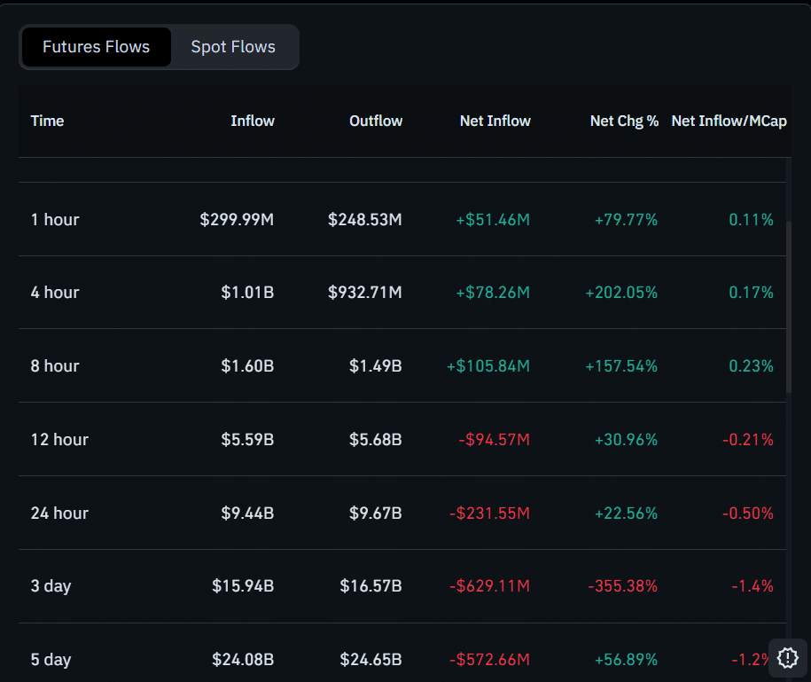 另一方面,Solana期货资金流数据显示市场情绪出现短期回暖。过去1小时内净流入5146万美元,增幅达79.77%。