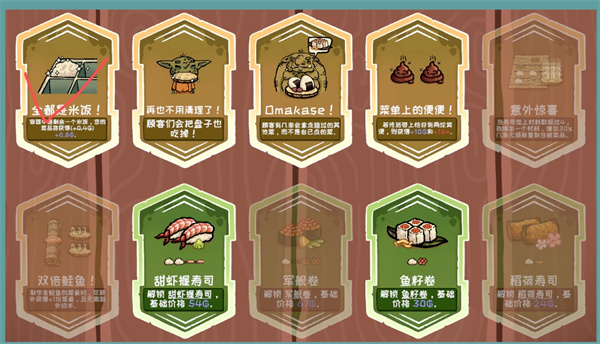 紫色牌,海台搭米饭 每添加一个海苔,寿司售价获得以下增益:(+0.03x)+0.06x乘以米饭容器中剩余米饭数