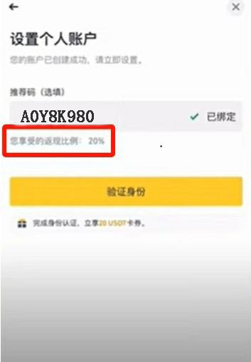 最重要的是邀请码这里,一定要填写上A0Y8K980,使用这个邀请码来注册币安的话,就能够让我们获得全网最高的手续费减免,20%的手续费减免。