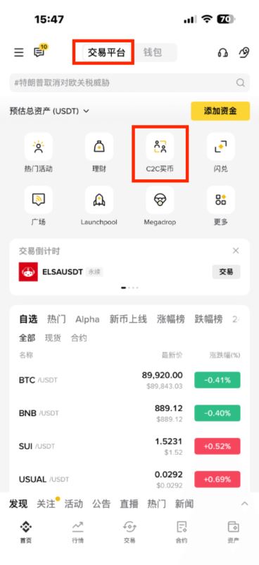 1.打开币安APP,在交易平台栏目点击C2C买币,如图