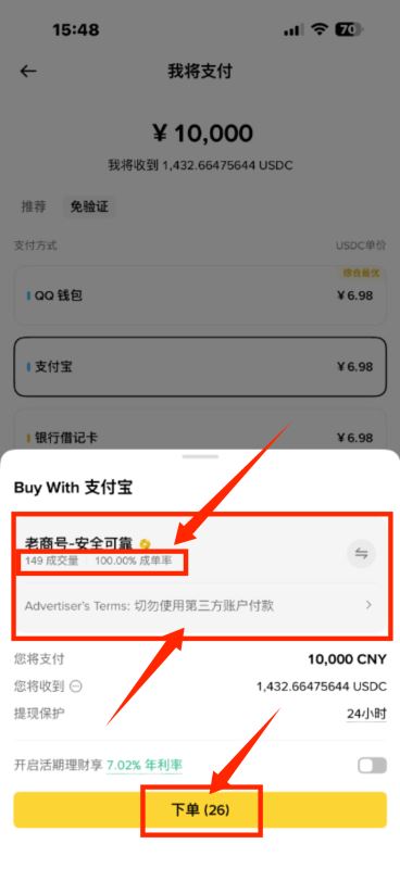 6.在下面,一般币安会直接推荐靠谱的币商,大家可以根据币商名字下面的成交量和成单率来选择靠谱安全的币商,最后点击下单即可,如图