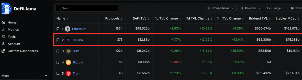 Jupiter:链上聚合交易平台,整合多个DEX 的流动性,提供顺畅的交易体验。之前透过JUP 空投成功吸引大量新用户,也成为Solana DeFi 的代表项目之一。Phantom 浅包:最受欢迎的Solana 浅包,支援多链资产与NFT 管理,几乎是所有Solana 用户的入门标配。Tensor / Magic Eden:Solana 上两大NFT 市场,前者主打专业交易介面与即时挂单功能, 后者则逐渐转型为多链NFT 平台,支援比特币Ordinals、以太坊与Polygon。Helium & Render:代表DePIN(去中心化实体基础建设)的落地应用。Helium专注于去中心化5G 与Wi-Fi 网路,用户可透过架设热点设备提供讯号覆盖并获得奖励;Render Network则打造全球分散式GPU 运算网路,让影像渲染、AI 模型训练都能透过区块链进行算力共享。两者都展现了Solana 在「实体世界基础设施」领域的潜力与扩展性。Pump.fun 与AI Meme 文化:2025 年的Solana 生态掀起AI + Meme 热潮。在Pump.fun 平台上,任何人只需支付少量SOL 币就能发行新币,再加上像Ghiblification这类AI 生成动漫风格的创作风潮,让整个生态充满创意与活力,也吸引更多年轻用户涌入。目前Solana 在DeFi 生态中的TVL 已突破12–13 亿美元,在所有公链中TVL 排名通常位居第二名,仅次于以太坊。