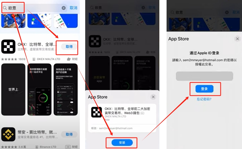 刚刚商家提醒我登录上去之后先退出,然后再重新打开就可以了。我们退出之后再重新打开。在搜索框搜索“欧易”,下方就是欧易OKX APP了。点击【取得】,点击【安装】,它这里还提示我们有密码,粘贴密码,点击【登录】。