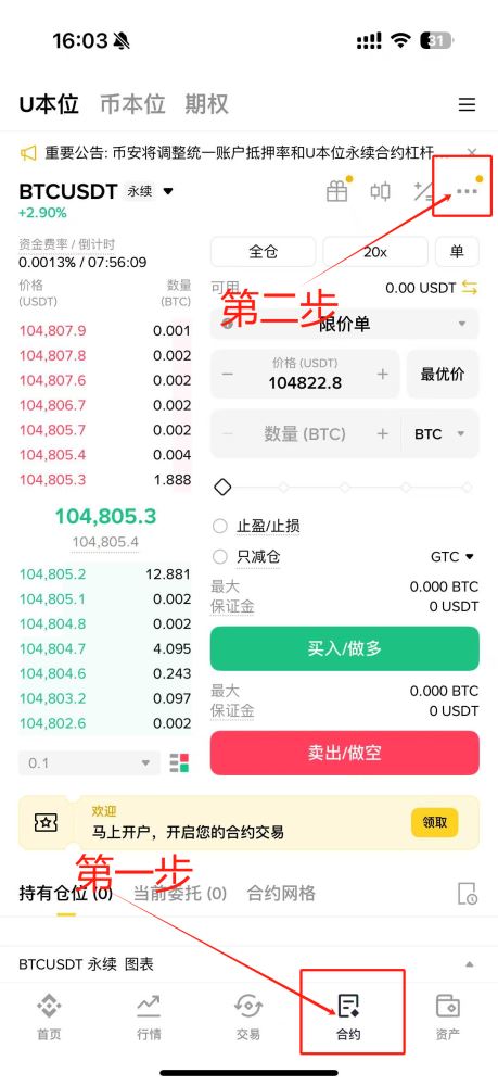 欧易平台的双向持仓功能需手动开启,具体操作流程如下:登录欧易APP后,点击左上角进入个人中心,选择"合约"选项。