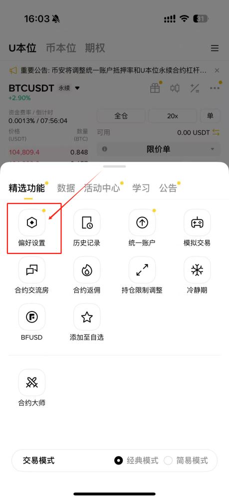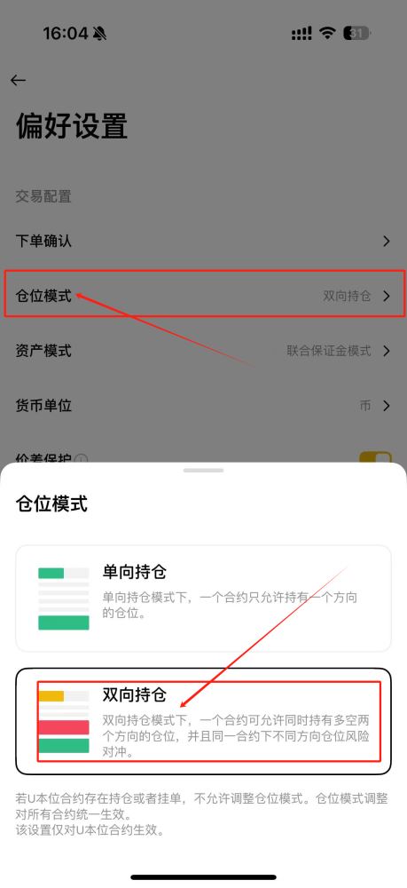 在偏好设置中找到仓位模式选项,确保已开通合约账户后,开启双向持仓功能。