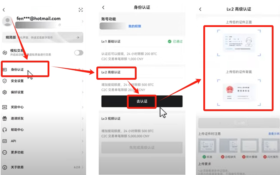 L2高级认证需上传身份 证正反面照片,可提升账户交易限额。