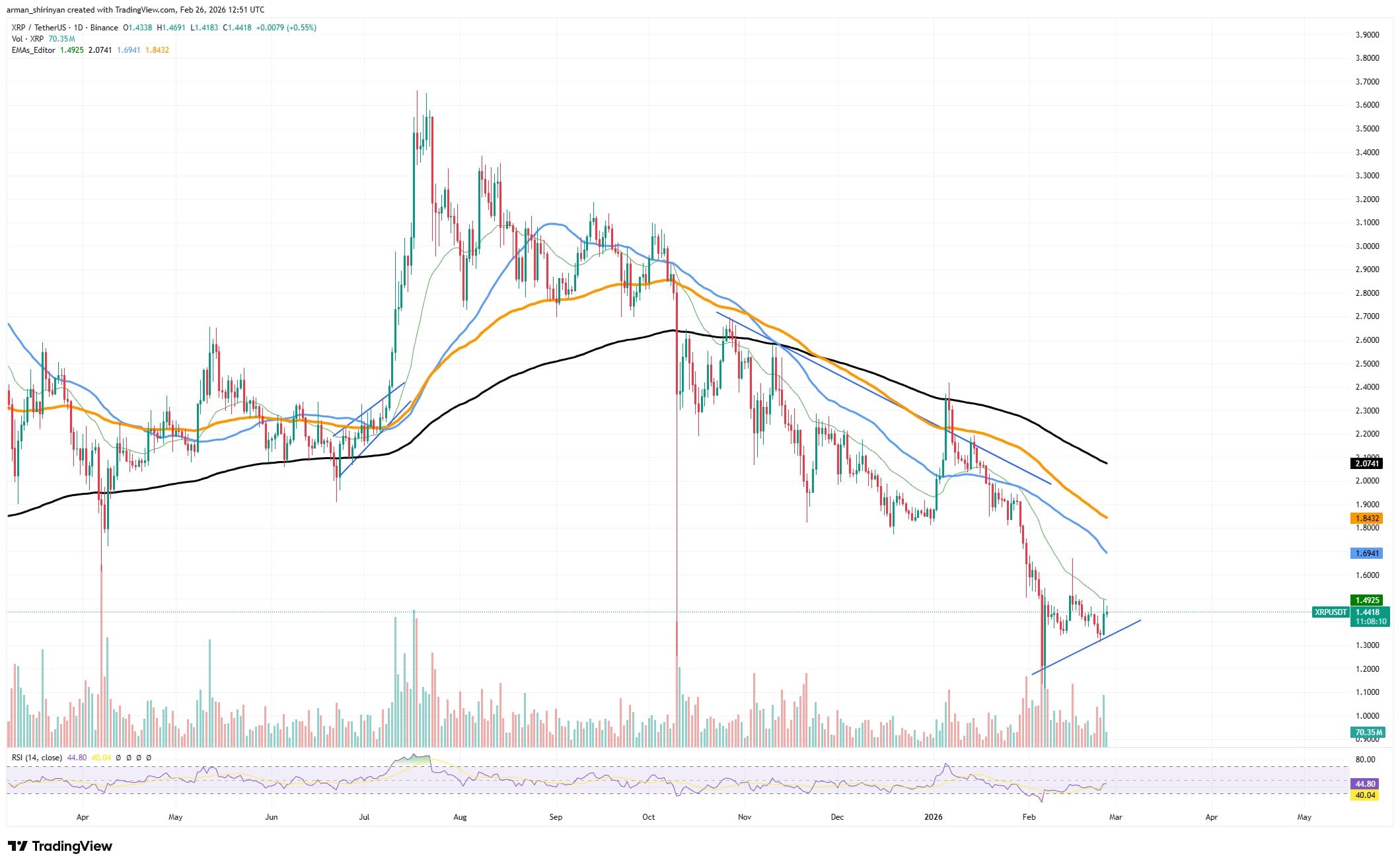 相较于早期波动,当前成交量下降印证了市场在等待催化剂才会采取大动作的观点。低波动性未必是坏事,但唯有通过扩张性突破才能转化为优势。XRP需出现迫使价格强势突破26日均线的波动方能反弹,否则随着市场兴趣消退,资产可能陷入横盘或渐进贬值。对XRP而言,波动性提升或许是最佳催化剂。