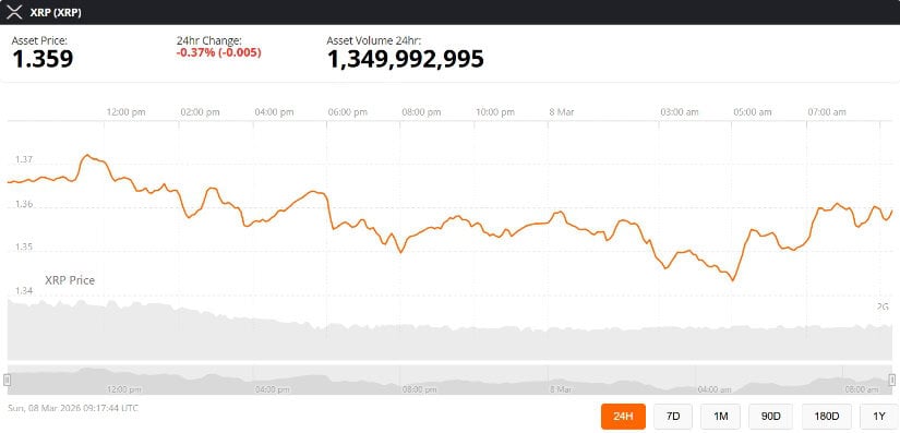 截至2026年3月8日,XRP现价徘徊在1.356美元附近,日内微跌约0.3%。此前该代币价格曾短暂冲高至1.43美元,但受加密货币市场整体疲软影响出现回落。