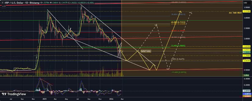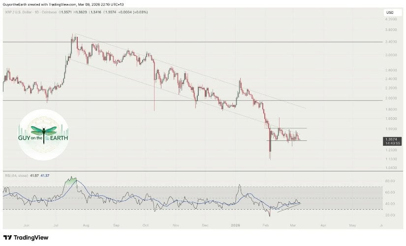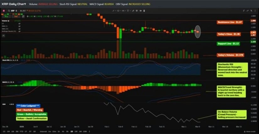 最新图表显示XRP市场进入短期整理阶段。3月7日收盘报1.36美元,较前日下跌0.04美元。