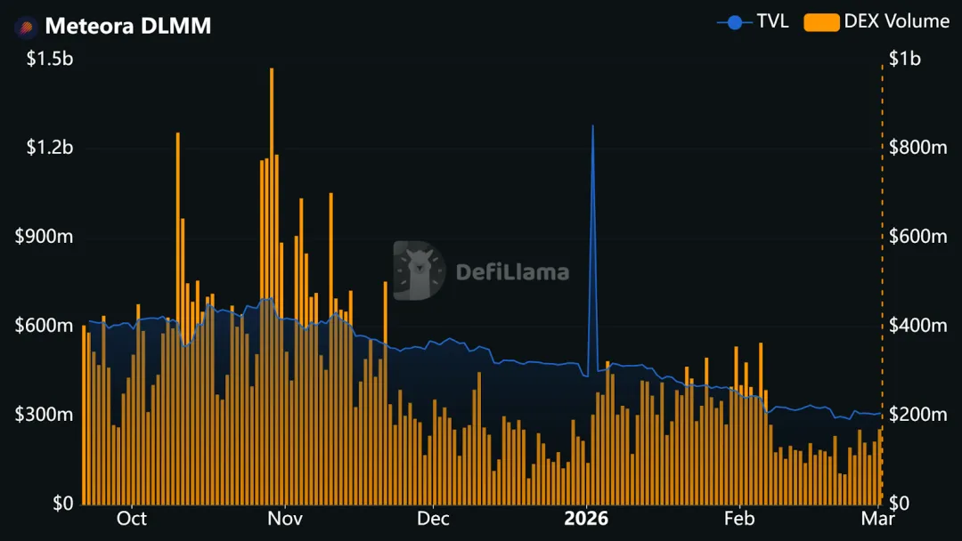 截至 2026 年初,DLMM 总锁仓价值约达到 3 亿美元左右,并在近 30 天内带来了数十亿美元的交易量,这在 Solana DEX 生态格局中占据了重要位置。