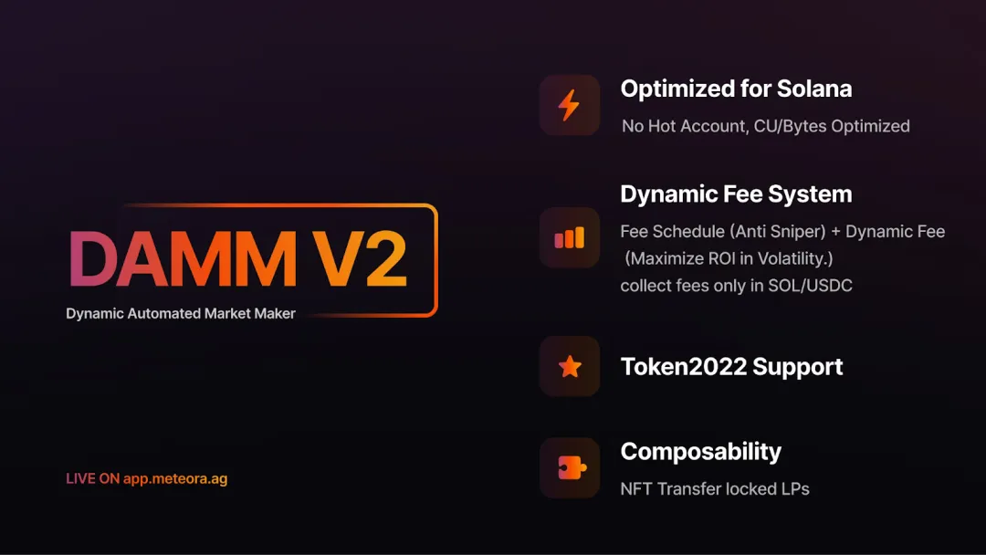DAMM v2 是全新一代 AMM,兼容 Solana Token2022 代币,并提供更丰富的功能。其特点包括:可选固定费率或动态费率机制、可在链上设置更高的动态费上限、内置反狙击(Anti-Sniper)机制,以及可部分集中流动性(Position NFT)的能力。