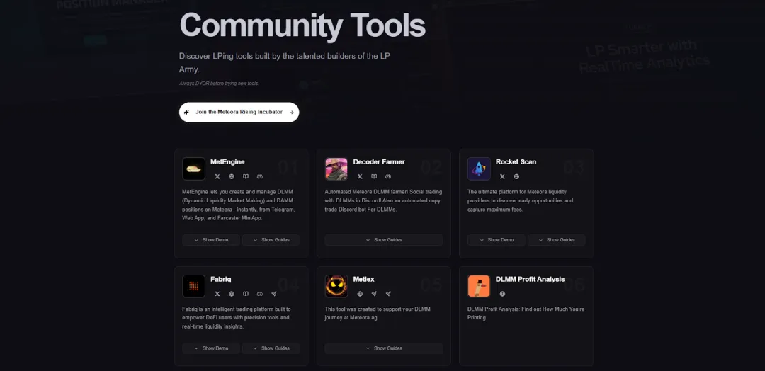 社区共建工具丰富:Metlex 为 DLMM LP 提供专业仪表盘,实时分析仓位绩效;Ultra LP 作为 LP 的“搭档”,汇总所有的收益和 PnL;GeekLad 提供的DLMM Profiler帮助 LP 优化策略;MetEngine 则通过 等渠道实现一键建仓与复制顶级策略。