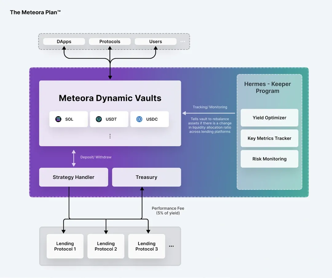 DAMM v1 是 Meteora 推出的首个 AMM,LP 可在其中获得交易费并额外赚取借款收益。在 DAMM v1 中,用户存入的资产会自动投放到后台的动态金库(Dynamic Vaults)并配置到借款协议中,获得额外的利息和奖励。
