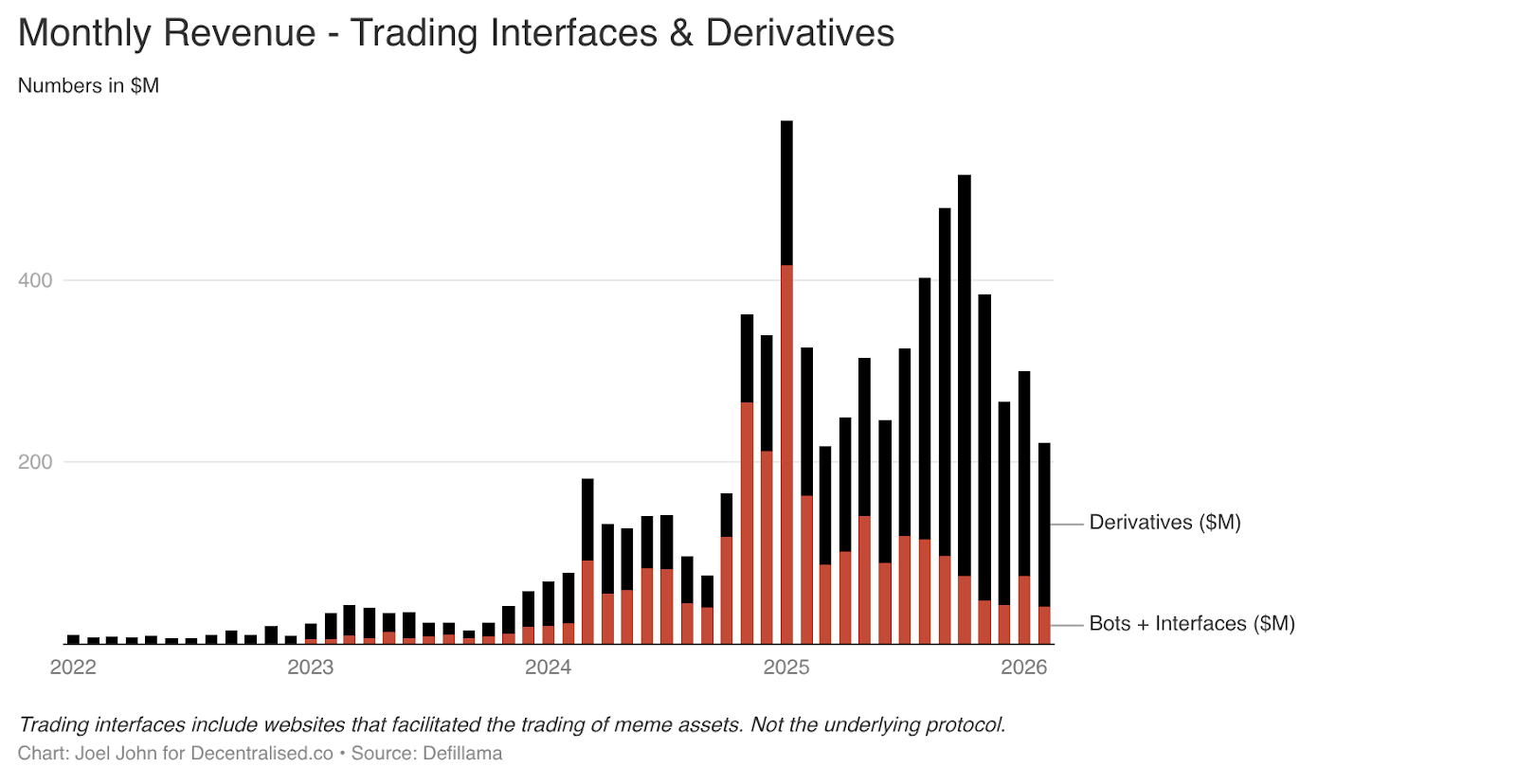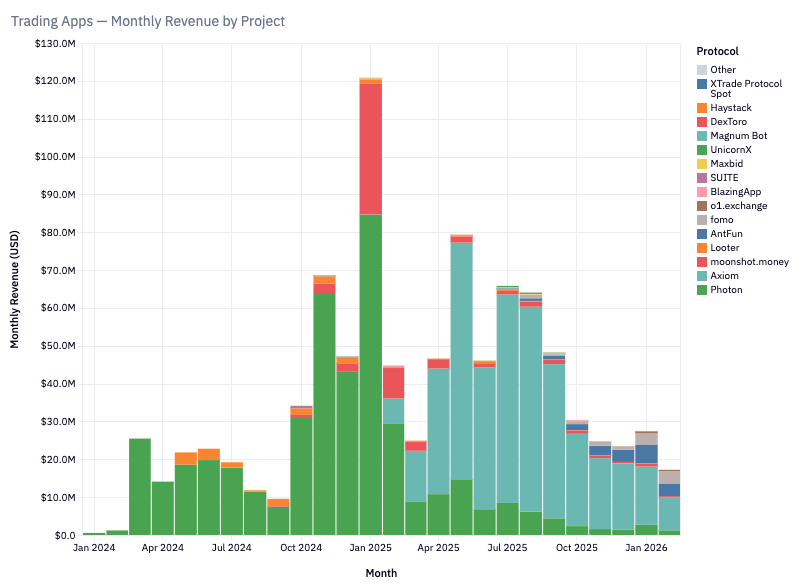 我们在 2022 年为之兴奋的那些原生功能如今都已经成熟。BullX 和 Photon 等应用程序正是基于这些功能构建的。仅该领域在 2024 年 1 月至 2026 年 2 月期间就创造了约 19.3 亿美元的交易费用。
