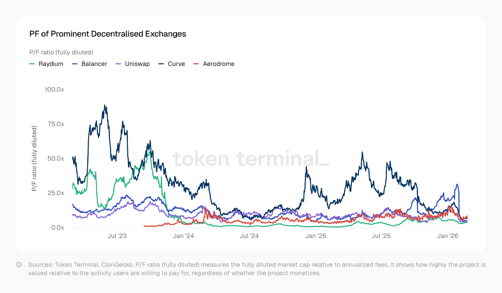 以 DeFi 基础项目的命运为例。投资者的选择过多和缺乏新意导致估值暴跌,即便这些基础项目确实推动了更多经济活动。这些市场高度分散,投资者有众多选择可以押注。“去中心化”或“基于区块链”的新鲜感早已消退。Kamino、Euler、Fluid、Meteora 和 PumpSwap 等项目相继涌现,但它们的价费比均低于 2022 年协议的水平。如下方 TokenTerminal 图表所示,DEX 的价费倍数在 2023 年至 2025 年间大幅下降。一些交易所的价费倍数现在甚至低至 1。