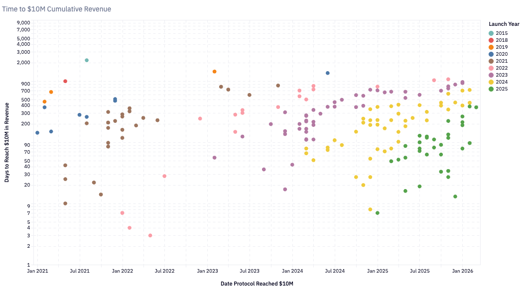 自 2020 年初以来,每个季度营收超过百万美元的团队数量稳步增长,目前已超过一百个。2020 年,那些需要 24 个月才能达到 1000 万美元年营收的协议都被认为是快速增长的。而到了 2024 年,协议达到这一里程碑的时间已缩短至大约六个月。Pump.Fun 于 2024 年初推出,仅用了大约两个月就达到了 1000 万美元的营收,创下了最快的增长速度纪录。