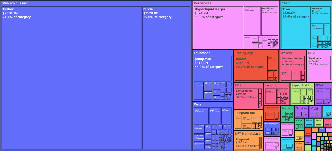 仅这两个领域,到 2025 年 1 月就贡献了 5.75 亿美元的费用。考虑到消费者的需求,这也不难理解。Meme 币交易和永续合约让用户能够快速获利。为了追求快速回报,他们愿意支付高额费用。该类别在 2022 年至 2025 年间,占总收入的比例从 1% 增长到略高于 15%。