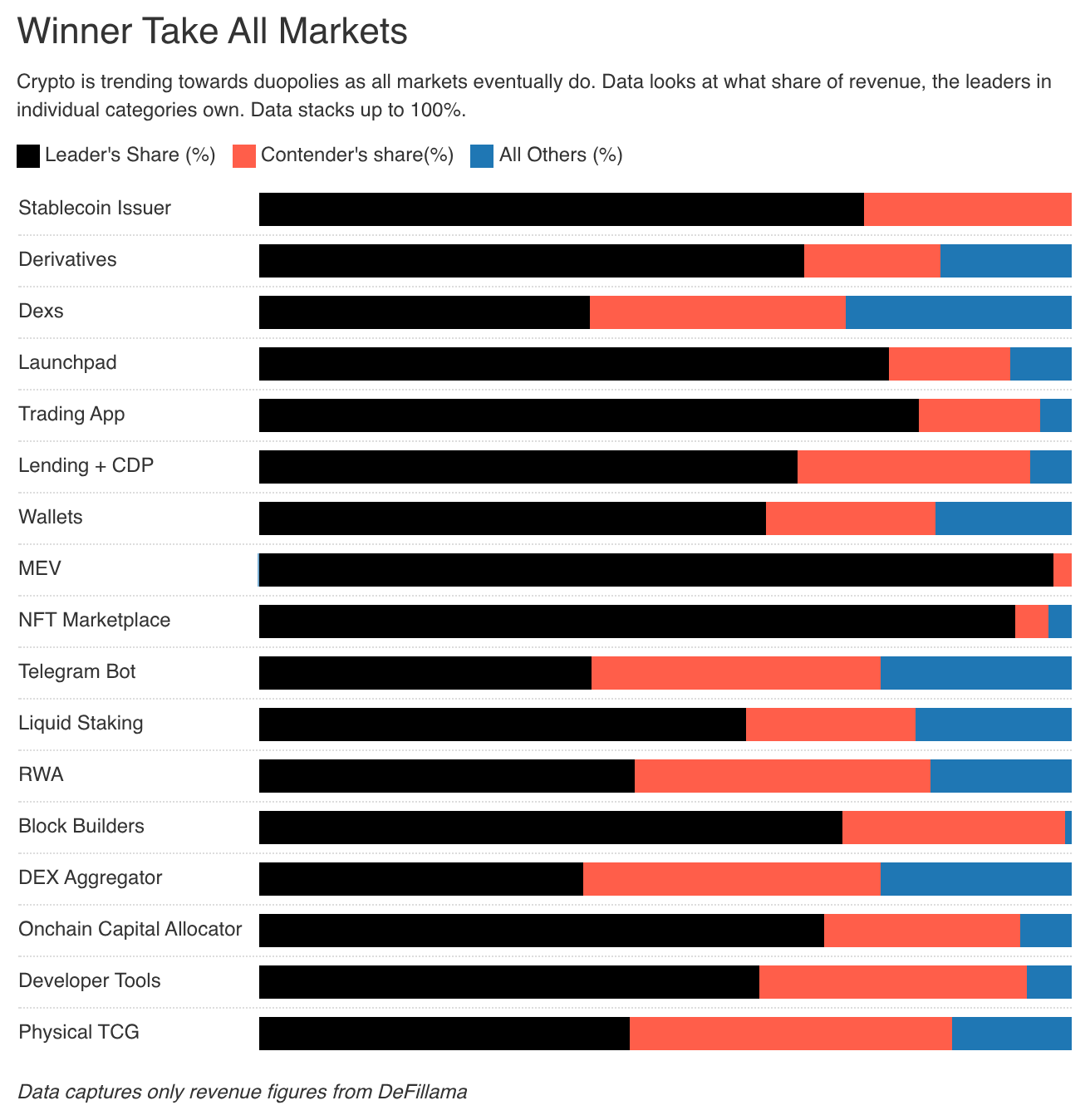 利润动机是资本市场参与者最纯粹的驱动力。人们普遍认为,市场最终会趋向极致效率。我们在行业领军者身上看到了这种趋势的体现。例如,我们看到的图表显示,多个细分市场的 70% 份额都掌握在两家关键企业手中。这是我们所有人都要面对的残酷现实,也是市场运作的残酷一面。对创始人来说,这意味着曾经流向他们代币的资金,现在正被重新分配到具有更高波动性或更高资本回报率的资产上。