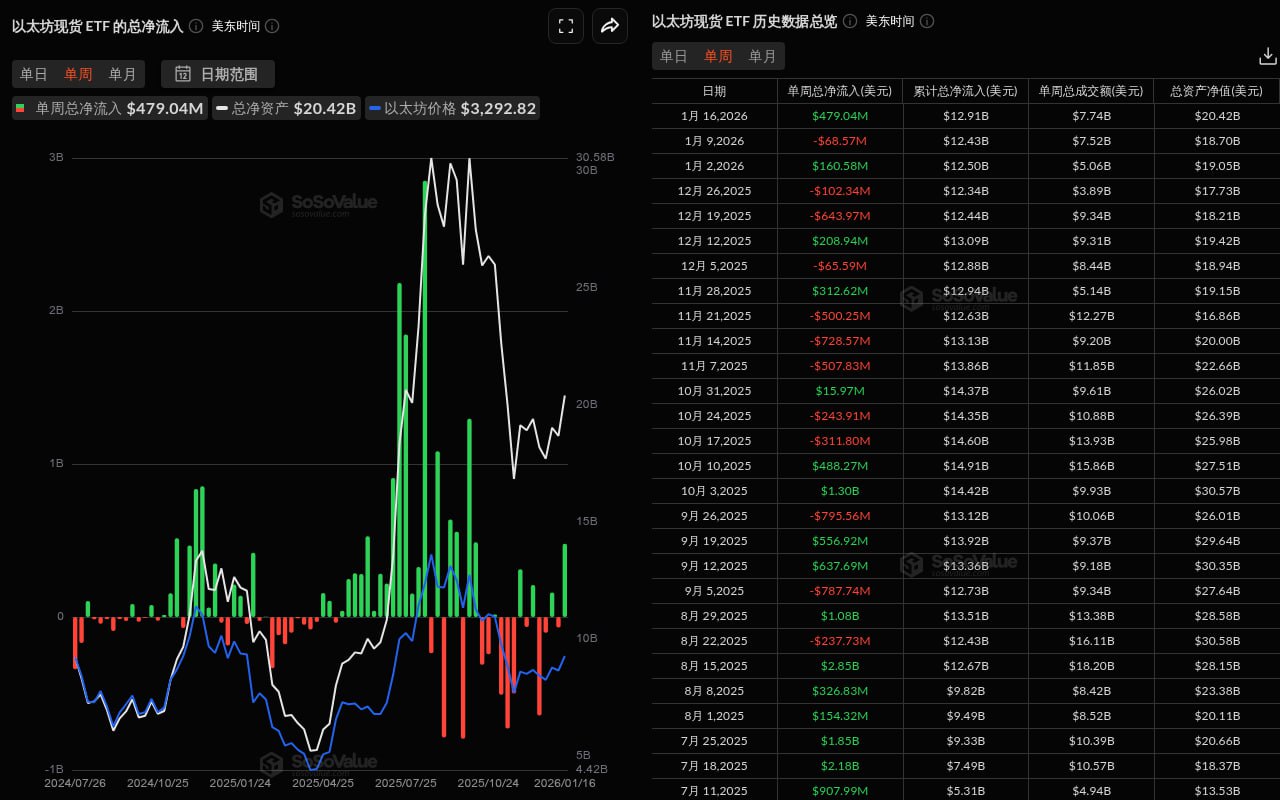 1月18日消息,根据 SoSoValue 数据,本周交易日(美东时间 1 月 12 日至 1 月 16 日)以太坊现货 ETF 净流入 4.79 亿美元。