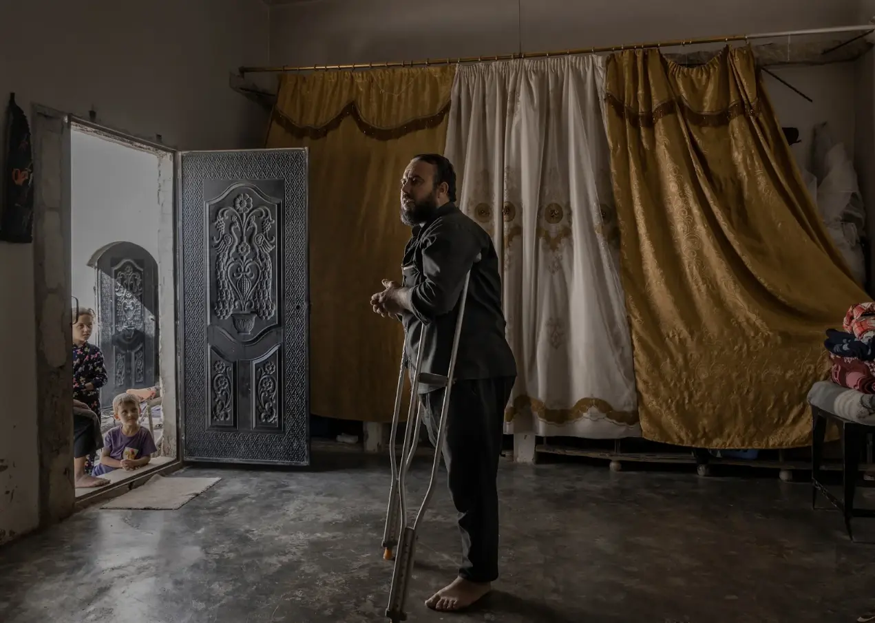 哈尔法亚居民 Abdul Moti Hammoud 驾驶拖拉机时不慎触雷,失去了一条腿。他是救援组织 Mercy Corps 的受益人。