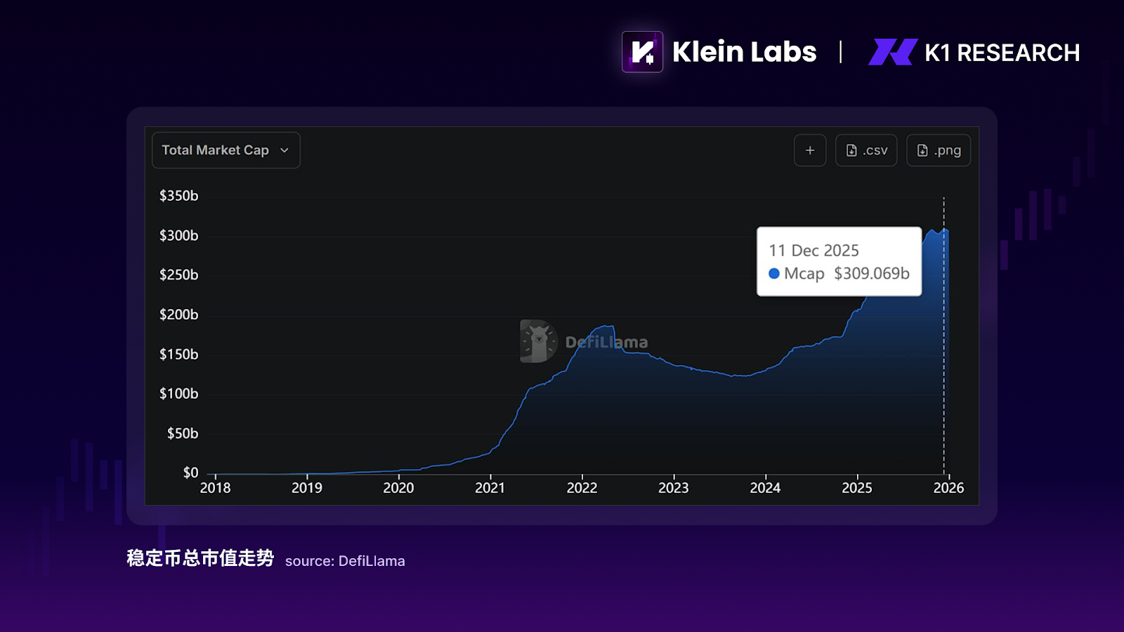 稳定币在这一过程中扮演了与以往周期完全不同的角色。过去,稳定币更多被视为交易所内部的“中介货币”或牛市中的杠杆燃料,其增长往往与投机活动高度相关。而在 2025 年,稳定币逐步演化为资金停留与结算工具。稳定币总市值从年初约 2000 亿美元增长至年末 3000 亿美元以上,全年增量接近 1000 亿美元,但同期山寨资产整体市值并未同步扩张。与此同时,稳定币年度链上结算规模达到数万亿美元量级,甚至在名义口径上超过传统卡组织的年交易规模。由此可见,2025年稳定币增长主要来自支付、清算与资金管理需求,而非投机杠杆。