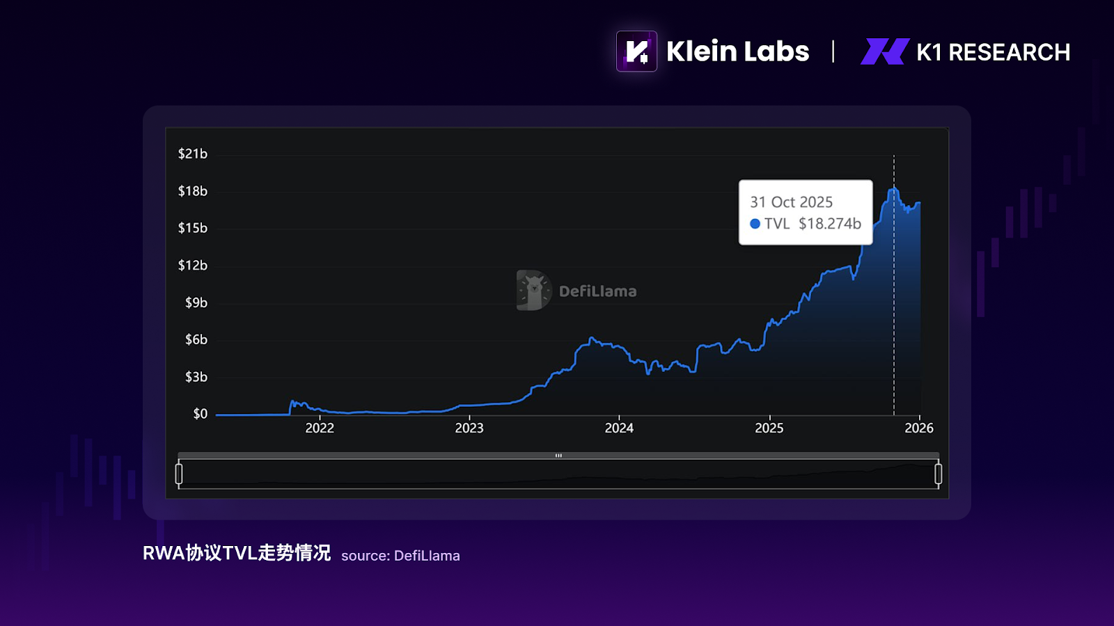 RWA 的发展进一步强化了这一趋势。2025 年真正落地的 RWA 主要集中在国债、货币市场基金份额及短久期票据等低风险资产,其核心意义并不在于制造新的价格弹性,而在于验证合规资产在链上存在的可行性。从链上数据来看,RWA 相关协议的TVL在2024年开始加速增长,并在2025年持续上行--截至 2025 年 10 月,RWA 协议 TVL 已接近 180 亿美元,较 2024 年初增长数倍。