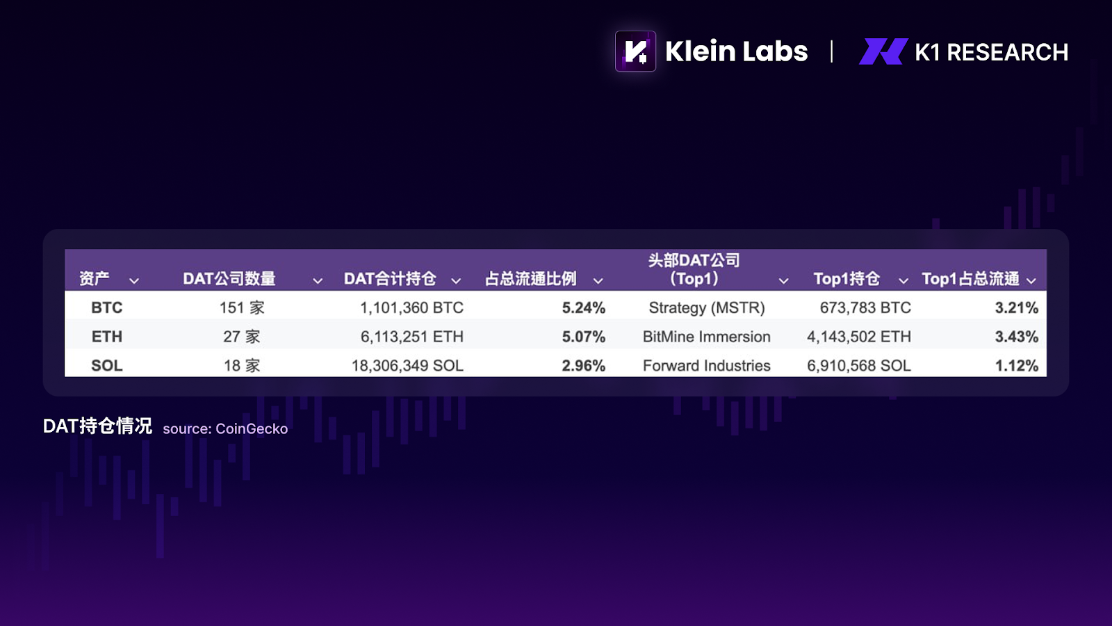 与 ETF 同样值得关注的,是2025年迅速兴起的 “币股公司”DAT(Digital Asset Treasury Companies)现象:上市公司将 BTC、ETH 乃至 SOL 等数字资产纳入资产负债表,并通过增发、发行可转债、回购与质押收益等资本市场工具,把股票塑造成“可融资、可加杠杆的加密敞口载体”。从规模看,已有将近200家公司披露采用类似 DAT 的策略,合计持有数字资产超过 1300 亿美元,DAT 已从个案演化为一类可被追踪的资本市场结构。DAT 的结构性意义在于:它与 ETF 一样强化了主流资产的资金吸附,但传导机制更“股权化”--资金进入的是股票估值与融资循环,而非直接进入长尾代币的二级流动性,从而进一步加剧了主流资产与山寨资产之间的资金分层。