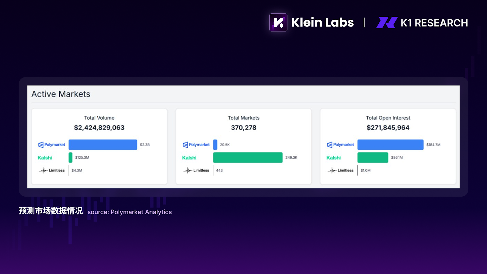 预测市场的本质是信息聚合,资金通过下注行为对未来事件进行“投票”,价格则在不断修正中逼近集体共识。从结构上看,这是一种天然存在、且相对更合规的“赌厂形态”:没有庄家操控赔率,结果由现实世界事件决定,平台仅通过抽取手续费获利。这一赛道的第一次高调亮相,出现在美国总统大选期间。围绕选举结果的预测市场在链上迅速聚集流动性与公众注意力,使其从边缘 DeFi 产品跃升为具备现实影响力的叙事方向。2025 年,该叙事并未退潮,而是随着基础设施成熟度提升、多个协议发币预期下而持续发酵。从数据层面看,2025 年预测市场已不再是小众实验。预测市场累计成交额已超过 24 亿美元,与此同时,全市场未平仓合约(Open Interest)维持在约 2.7 亿美元水平,显示这并非短期博弈流量,而是真正有资金在持续承担事件结果风险。