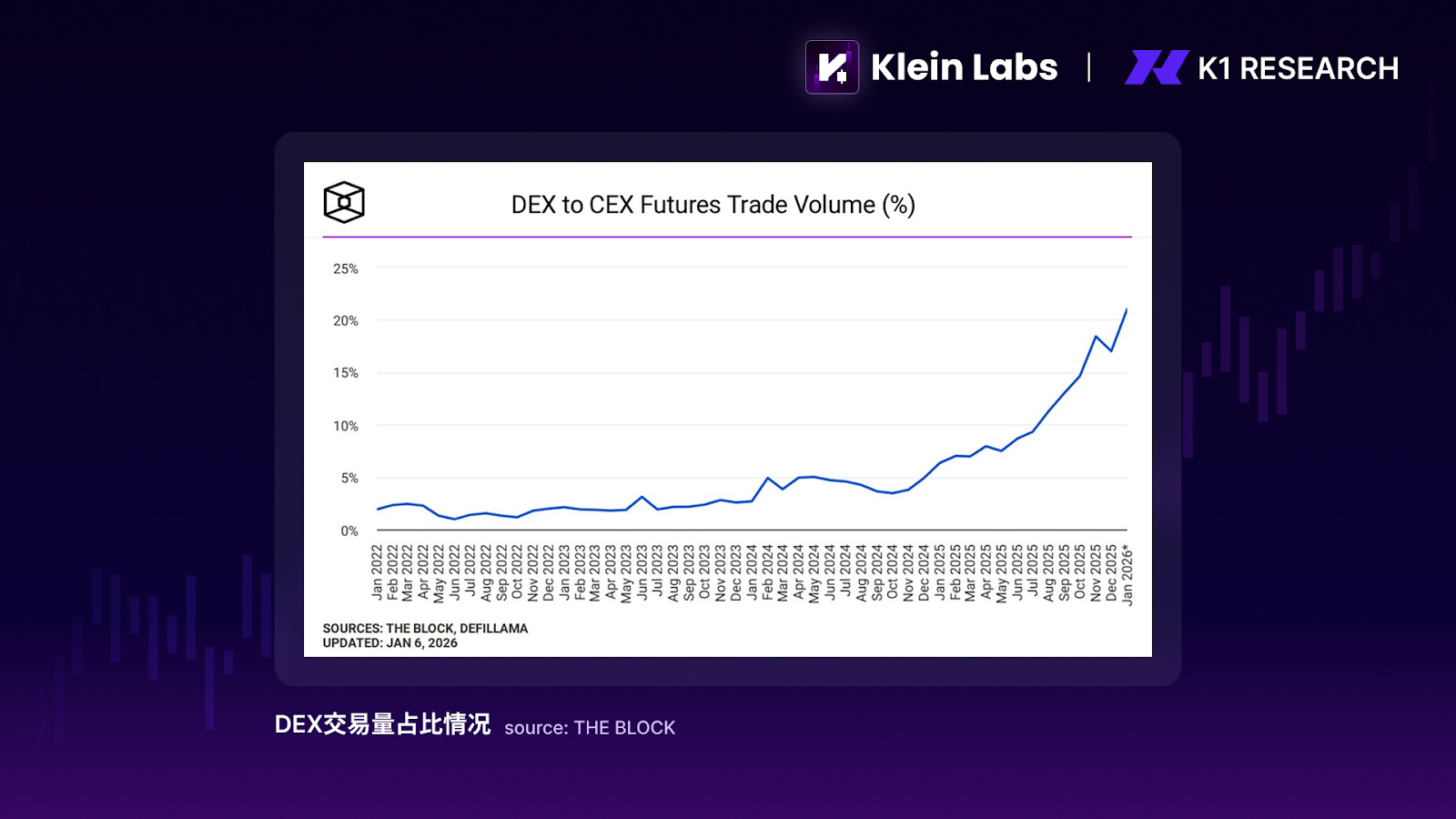 Perp DEX 的崛起则更加直接地指向加密行业的核心产品形态--合约交易。其意义并不在于“链上是否比链下更快”,而在于将不透明、高对手方风险的合约市场,引入一个可验证、可清算、无信任依赖的环境中。透明的仓位、清算规则与资金池结构,使 Perp DEX展现出不同于中心化交易所的安全属性。然而,必须承认的是,2025 年绝大多数合约交易量仍集中在 CEX,这并非信任问题,而是效率与体验问题的结果。