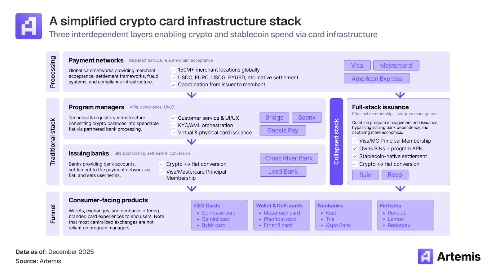 基础设施。加密卡业务由三层组成:支付网络(V,isa、Mastercard)、卡项目管理方和发卡机构,以及面向消费者的终端产品。尽管 V,isa 和 Mastercard 的卡项目数量几乎相同(均超 130 个),但 V,isa 凭借与基础设施提供商的早期合作,占据了超 90% 的链上卡交易量。最重大的结构性发展是全栈发行方的出现--像 Rain 和 Reap 这样的公司,它们直接拥有会员资格,并将项目管理与发卡相结合,绕过传统发卡银航的依赖关系,从而在每笔交易中获取更多收益。