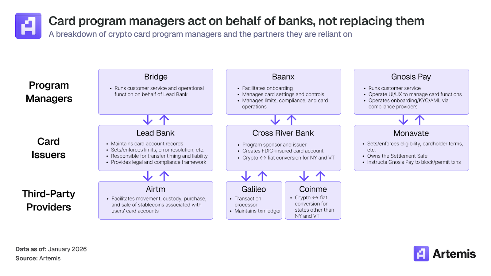 项目管理平台通常与持有 V,isa 或万事达卡主要会员资格的发卡银航合作,管理 BIN 赞助关系,处理合规要求,并运营从用户创建的银航账户到所需支付网络的结算系统。各个项目管理平台负责将用户关联数字钱袋中持有的加密资产或稳定币转换为法定货币,使其与发卡银航的结算基础设施兼容。项目管理平台提供白标功能,使其他公司能推出自有品牌的卡产品。这些白标卡项目管理公司的例子包括 Baanx、Bridge 和 Gnosis Pay。