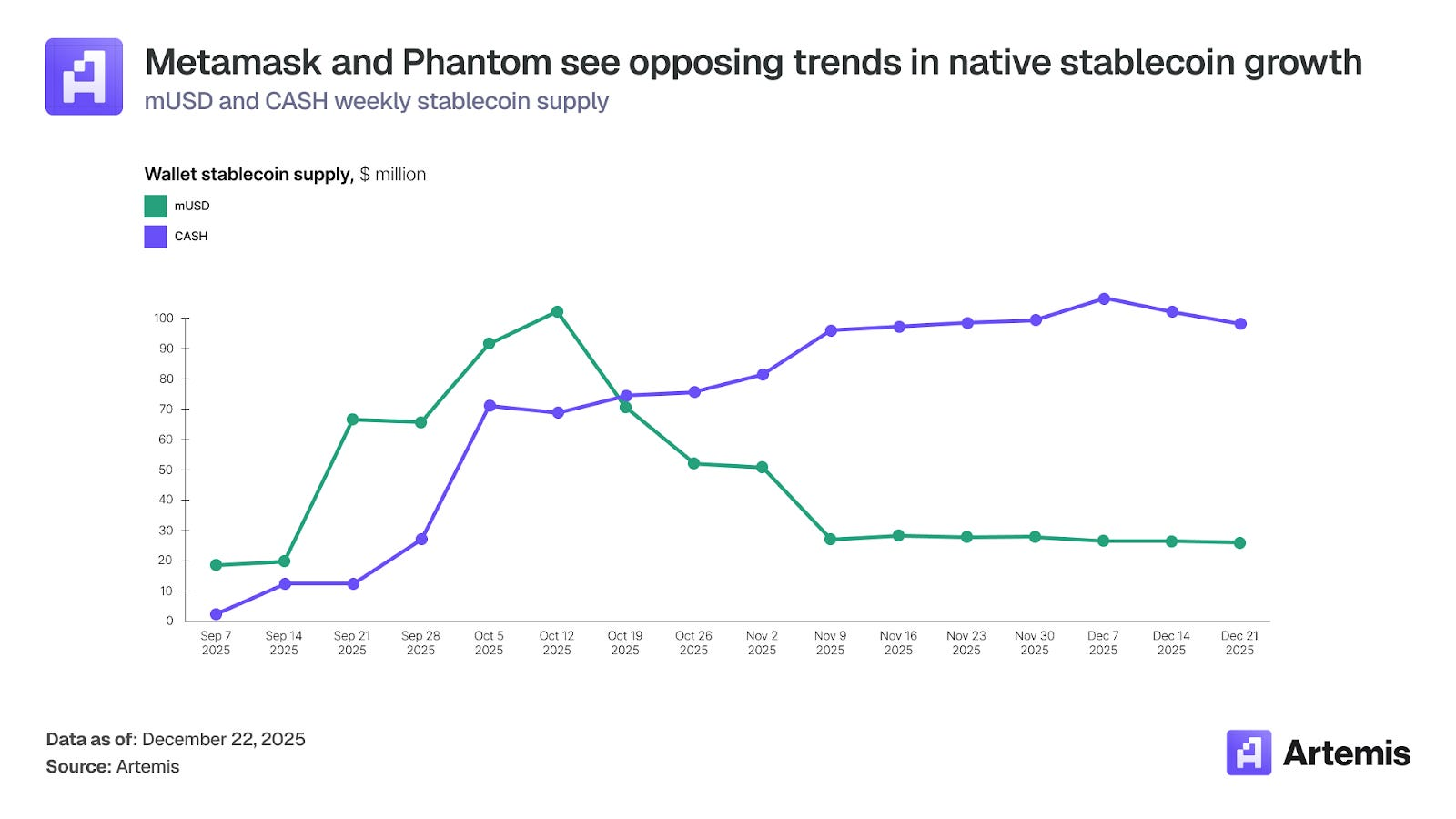 早期数据显示,两者的发展轨迹截然不同。Phantom 的 $CASH 供应量从 9 月份的约 2500 万美元稳步增长到 12 月底的约 1 亿美元,表明其用户接受度和留存率持续稳定。相比之下,MetaMask 的 mUSD 在 10 月初一度接近 1 亿美元,随后回落至约 2500 万美元,跌幅高达 75%。