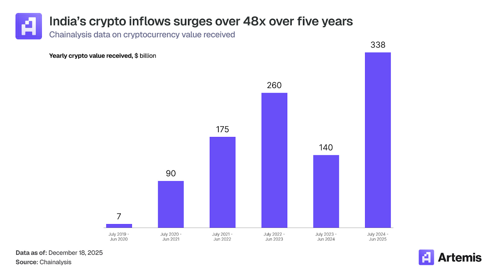截至 2025 年 6 月的 12 个月里,印度凭借 3380 亿美元的资金流入成为亚太地区最大的加密市场,五年间增长了 48 倍。然而,如此庞大的交易量几乎完全游离于正规经济体系之外,造成了全球最大的“去银航化”缺口,即实际加密货币活动与受监管合规渠道之间的巨大鸿沟。