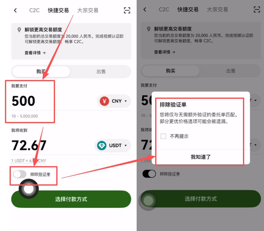 输入你想要购买的r民币金额。这里有一个细节:关于“验证单”的筛选。