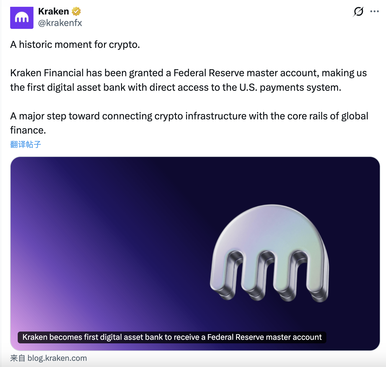 3月4日,Kraken宣布旗下银航Kraken Financial已正式获准开立美联储主账户,成为美国历史上首家直接接入美联储支付基础设施的数字资产银航。