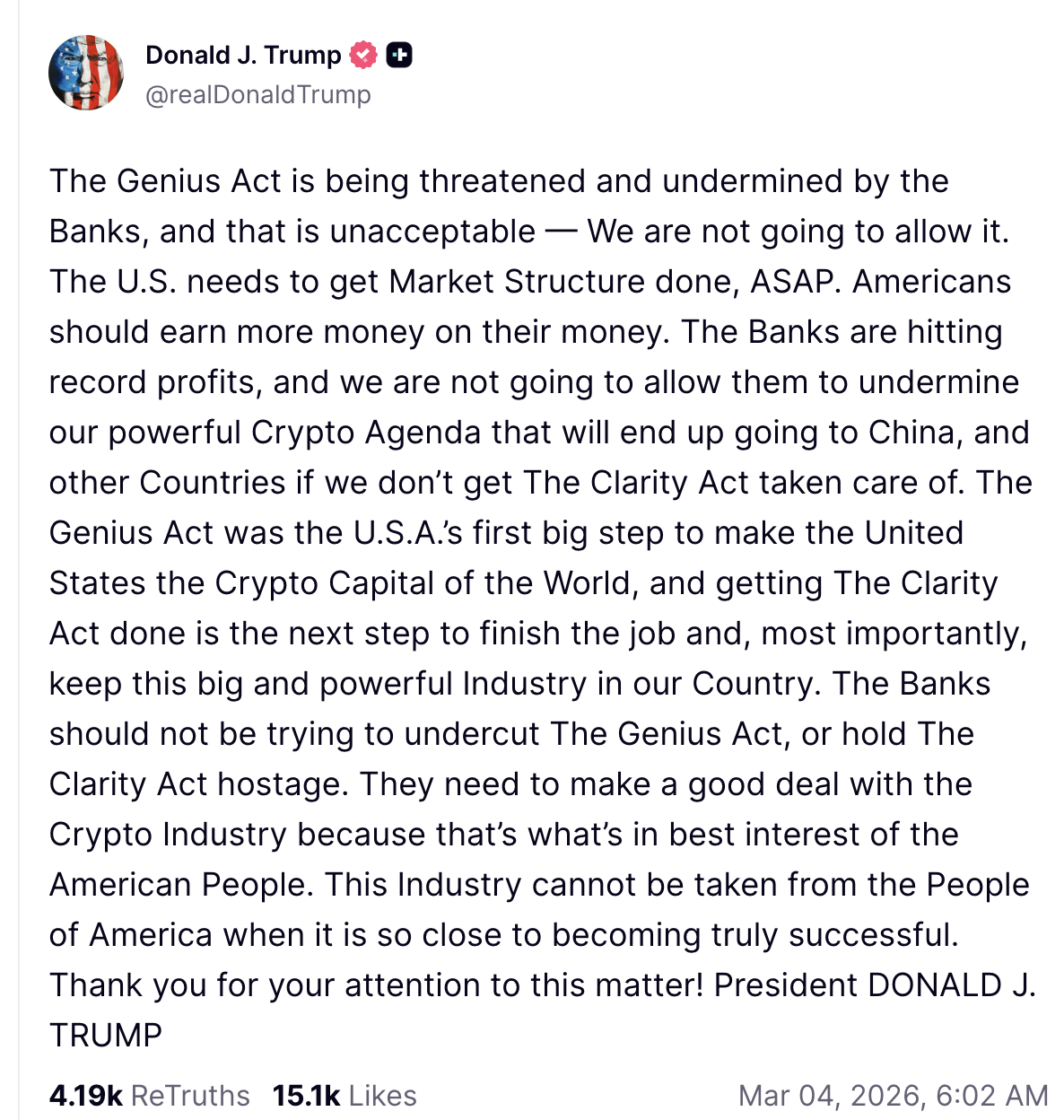 双方各执一词,互不相让。而特朗普在其社交平台Truth Social上对此发文,强烈批评银航机构试图破坏GENIUS法案并阻挠CLARITY法案的通过。他表示这些法案对于确保美国成为“加密货币之都”至关重要,并警告如不采取行动,该产业可能流向其他国家。特朗普敦促银航与加密货币行业达成协议,强调这符合美国人民的最佳利益,并呼吁尽快完成市场结构改革,让“美国人从他们的资金中获得更多收益”。