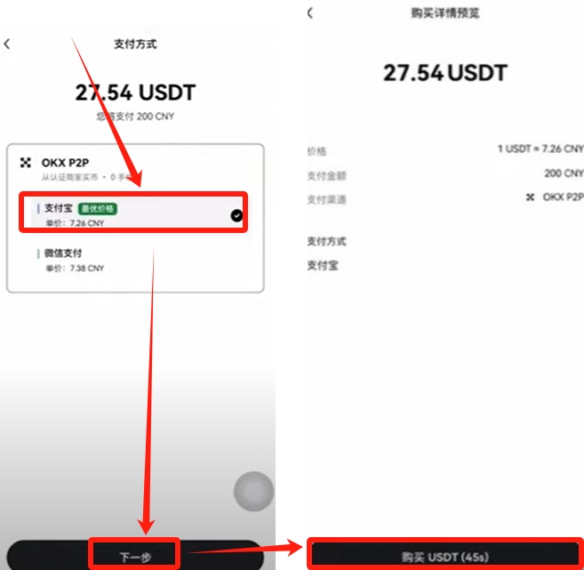 里面有支付宝、微信、储蓄卡。我这里没有绑定储蓄卡所以没有显示。可以看到支付宝的报价是最优的,所以我们就选择【支付宝】。当然也会有储蓄卡或者微信支付的方式。点击【下一步】,再点击【购买USDT】,系统就会自动为你匹配商家。