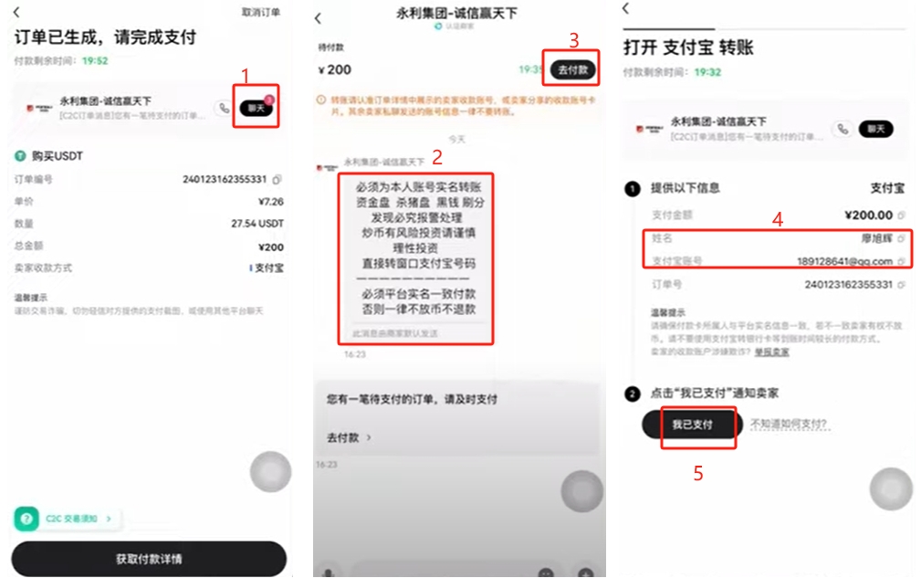 我们就按照他的要求给他付款。点击【去付款】,找到他的支付宝账号,直接给他转钱就可以了。付完款之后,点击【我已支付】。当卖家看到了钱,就会点击他那边一个收到钱的按钮,然后USDT就会被放到你的账户中。