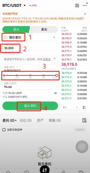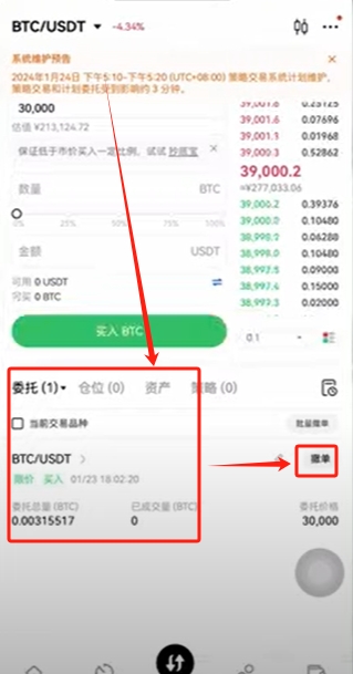 对于散户来说如果你想抄底的可以用这个限价单方式来做策略。选择【限价单】。比如说我认为比特币现在是39000多,我想在3万的时候抄底。那么你就可以直接把价格设置成30000,数量拉满,点击【买入BTC】。