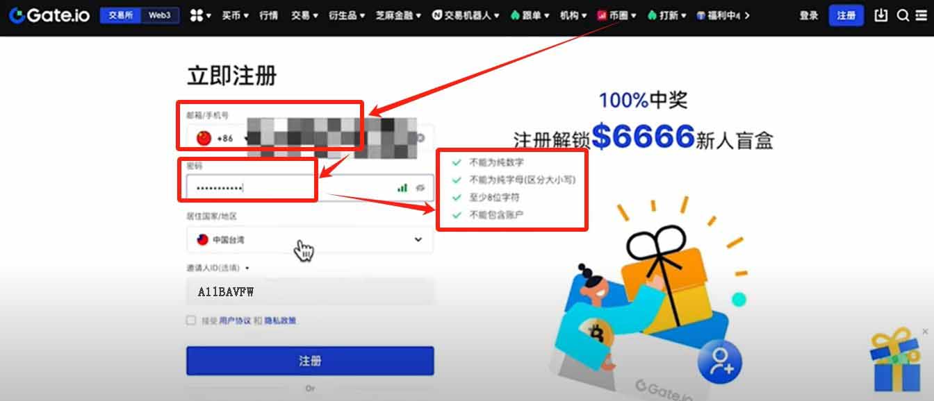 进来之后就可以进行注册了,我们可以通过邮箱号或者是手机号来进行注册。GT交易所也是支持中国大陆手机号注册的,我这里就使用手机号来进行注册。输入手机号,在设置一下密码,它告诉我们要求“不能为纯数字,不能为纯字母(区分大小写),至少8个字符,不能包含账户”,我们按照要求来设置一下。