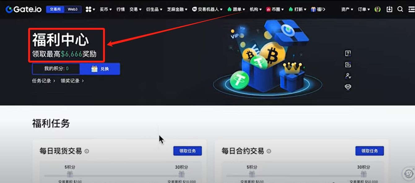 做完KYC认证之后,我们首先看一下我们的一些新手礼包,还有相关的一些福利。我们点击上方的“福利中心”。