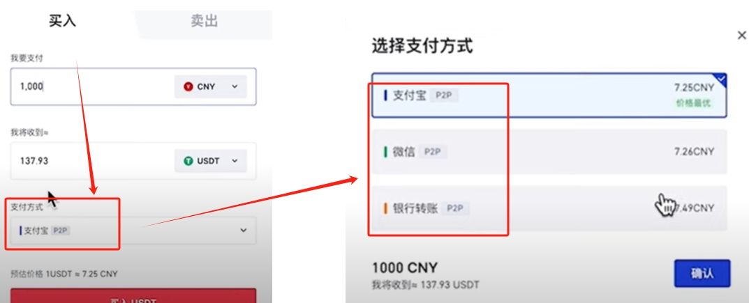 这边显示支持300多种支付方式,将近100种琺幣。其中包括Visa银联,比如说我们中国大陆用户,目前要购买对应的USDT,比如要购买1000r民币的USDT,就可以在右侧找到“chy”,就是r民币。输入要购买的金额,下方会自动给我们算出来,支付1000r民币将收到137.93颗USDT。只要你上方输入要购买的金额,下方就会自动为你算出来你要购买的数量。