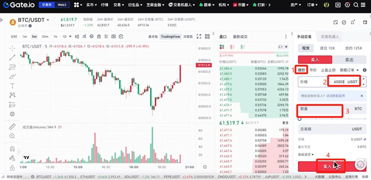 “限价”就是我们自己可以设置一个价格,比如我输入60000,也就是当比特币的价格跌到60000的时候,我们这笔订单才成交。期间只是挂单,不会产生交易,不会产生手续费。今天的价格目前是61519,交易额这里我可以手动输入,你要购买的金额,点击【买入BTC】就可以了。当比特币的价格跌到60000的时候,我们这笔单就成交了。