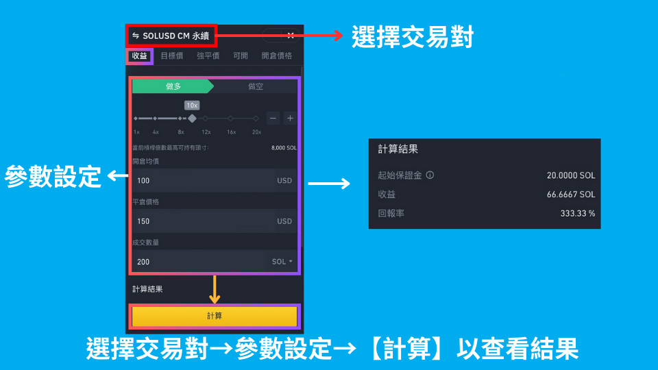 相比 U 本位合约,币本位合约计算会比较难直觉的理解。以币安为例,可以利用币安内置的的币本位计算机,去计算币本位的收益、目标价、强平价。