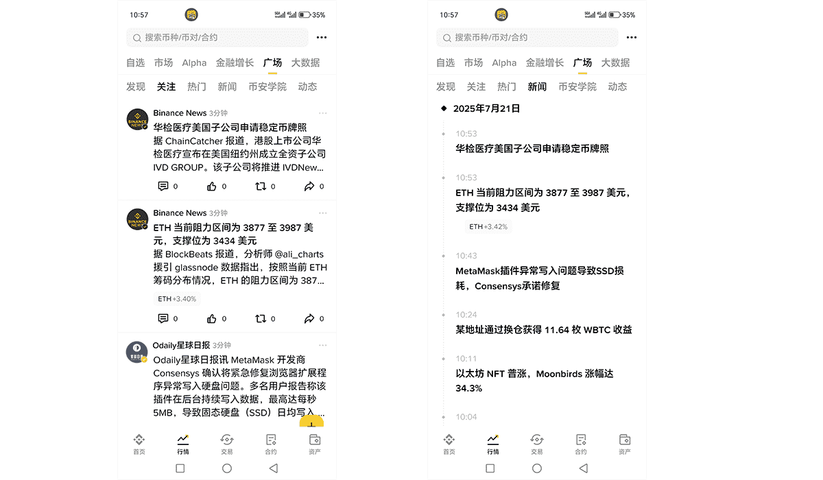 完成注册登录后,在APP底部导航栏选择"行情"标签,顶部倒数第二个即为Binance Feed入口。平台提供发现、关注、热门等多个内容分类,满足不同用户的浏览需求。