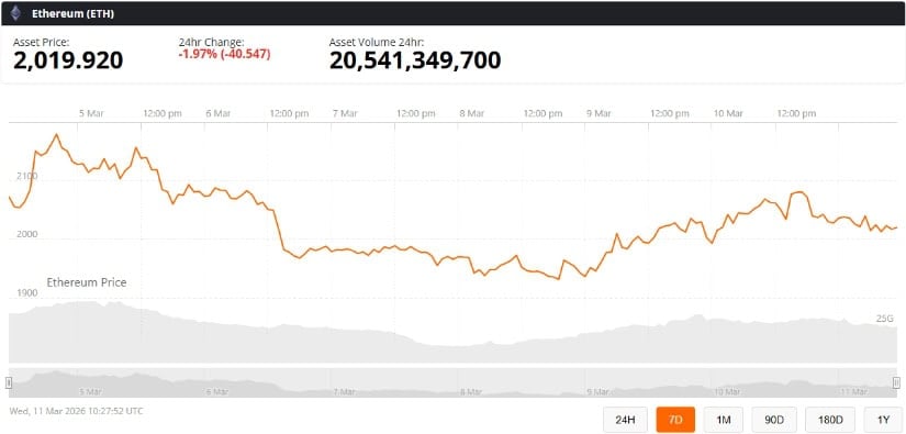 截至2026年3月11日,以太坊交易价格约为2,019美元,较3月9日1,937美元附近的低点反弹约4%。尽管复苏幅度有限,但整体市场结构表明ETH仍处于过去一年来形成的宽幅震荡区间内。伴随24小时交易量突破700亿美元,市场持续吸引强劲参与,投资者正密切关注近期反弹能否向更高阻力位延伸。