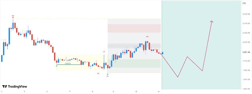 该上升通道以一系列受控价格波动为特征,每次回调均在趋势线下沿获得支撑。随着通道发展,阻力位逐步上移,为价格通向2,200美元及以上铺就潜在路径。