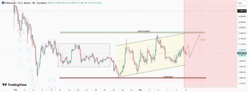 以太坊在上升通道内呈现短期看涨复苏,ETH/USD价格正逼近2,200至2,400美元关键阻力区。数据来源:TradingView@JohnOscar_Market_Structure