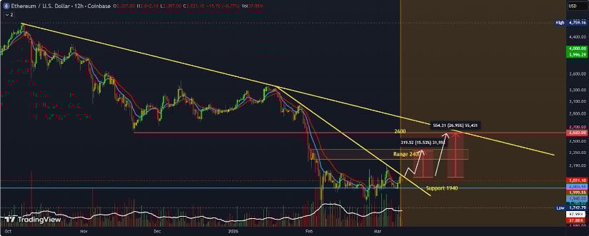 若2,000美元上方动能增强,以太坊或冲击2,400-2,600美元区间;但失守1,940美元支撑可能引发跌向1,400美元的行情。数据来源:TradingView@CaptainMilo